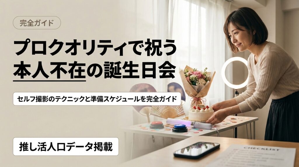 「本人不在の誕生日会」とは、ファン同士で「推し」の誕生日を祝うイベントです。準備の手順から場所選び、費用、SNSで映えるセルフ撮影のコツまで、プロクオリティで思い出を残す方法を徹底解説。予算別のモデルプランや撮影テクニックも紹介します。 推... -